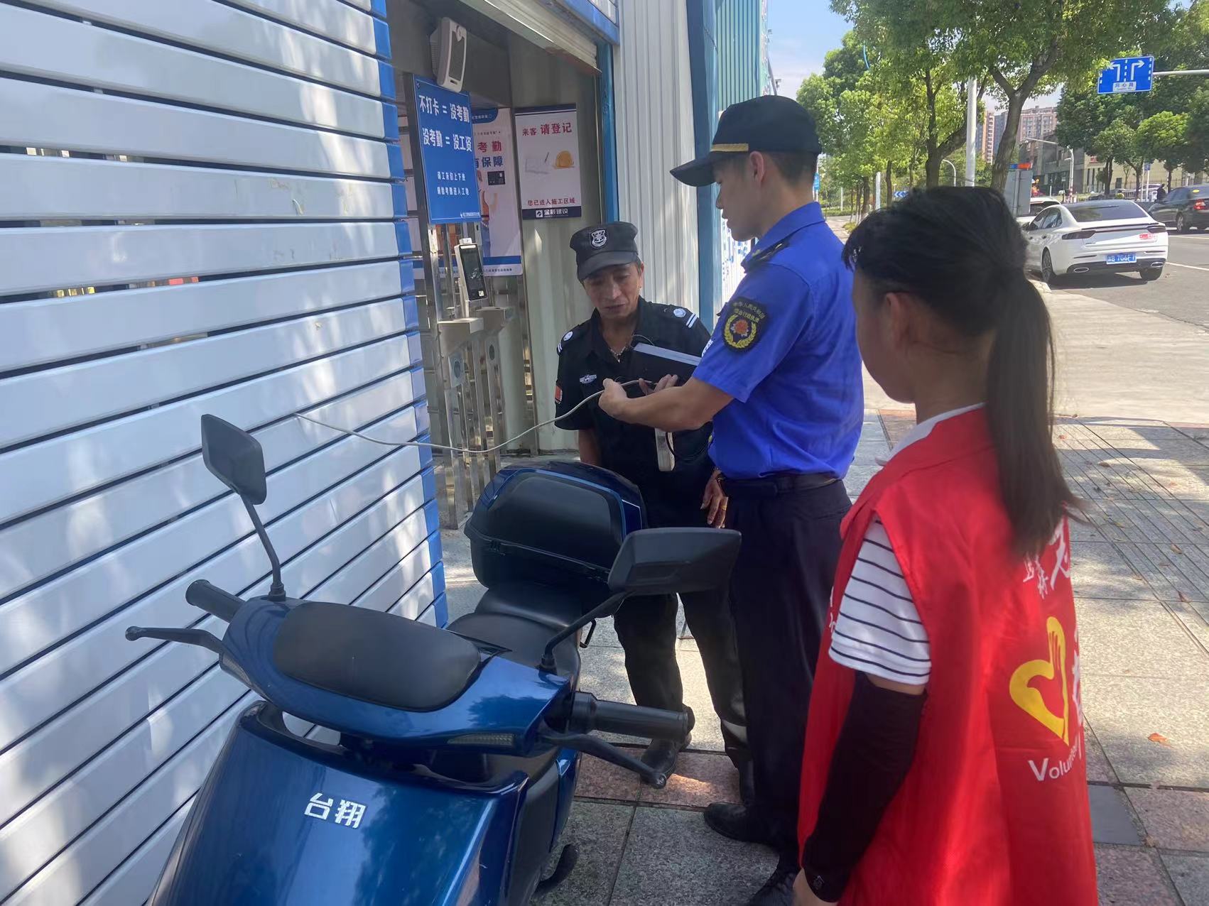 随后,大家一起把思源路等两侧沿路随意摆放的共享单车进行规范摆放。摆放完乱停放的共享单车后,执法人员发现旁边建工地门口有电瓶车“飞线”充电情况,便向年轻的志愿者介绍如何进行现场普法+执法即对违规充电行为进行处理,让其观察和体验。执法人员立即找来该电瓶车车主,告知“飞线”充电存在的安全隐患和潜在危险,引导车主立即撤除“飞线”,现场进行教育“提醒”。
