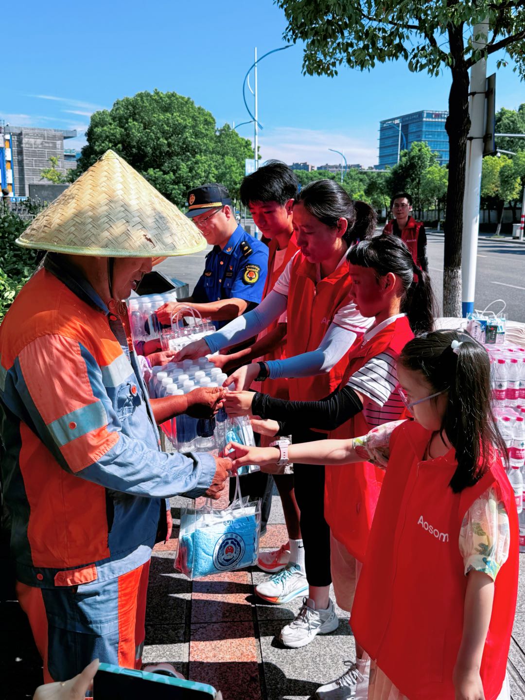 虽已立秋,依然酷暑,室外气温都高达40°+,负责城市保洁的环卫工人每天凌晨两三点就起来开工,高温天依然坚守在保洁第一线。为了给他们防暑“降温”,我们一起送上矿泉水、毛巾、人丹等“清凉”爱心物质。